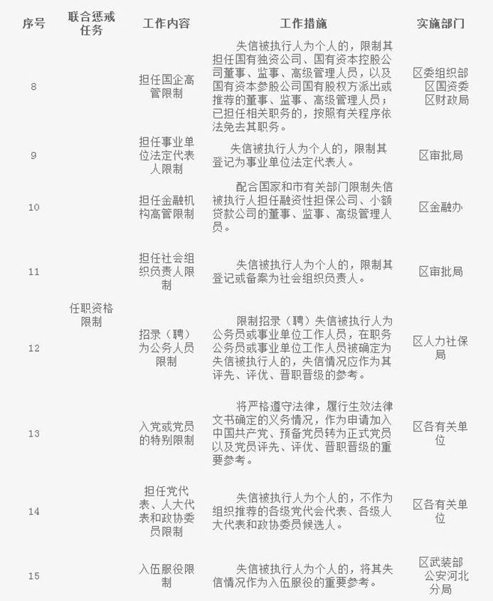 (一)联合惩戒措施。建立失信被执行人信用监督、警示和惩戒目录制度,定期发布、动态调整。制定惩戒措施,明确任务分工,从从事特定行业或项目限制,政府支持或补贴限制,任职资格限制,准入资格限制,荣誉和授信限制,特殊市场交易限制,限制高消费及有关消费,协助查询和控制,加强日常监管检查,加大刑事惩戒力度,履行国防义务,鼓励其他方面限制等十二个方面,对失信被执行人开展联合惩戒工作。各联合惩戒单位要按照《失信被执行人信用监督、警示、惩戒工作分工》(以下简称《工作分工》,见附件)要求,扎实开展联合惩戒工作。《工作分工》中未列明具体事项的,各联合惩戒单位按照职责分工分别负责。