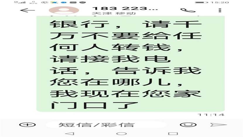 7月3日,公安和平分局五大道派出所社区民警陈光在一小区走访时了解到,小区居民金奶奶当日上午接到一电话后,便欲出门到银行给对方汇款。陈光意识到金奶奶很可能遇到了电信网络诈骗,便一边拨打电话联系其家属,一边往金奶奶家中赶去。经了解,金奶奶接到冒充“公检法”工作人员的电话,称其的身份信息遭盗用,并已涉嫌违法,金奶奶信以为真,经过民警的努力劝说,终于打消了出门汇款的念头。