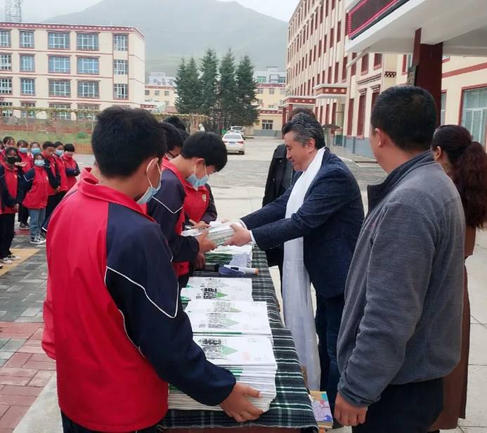 郜建辉5次入甘参加教育帮扶工作,他发现碌曲县中学在中考毕业班的教学中,教师和学生们手中的资料很少,且应考复习的方向也比较发散。于是,为全体毕业班学生捐赠了价值7千元的适用于当地考情的全科中考复习资料,助力学生们的中考复习。